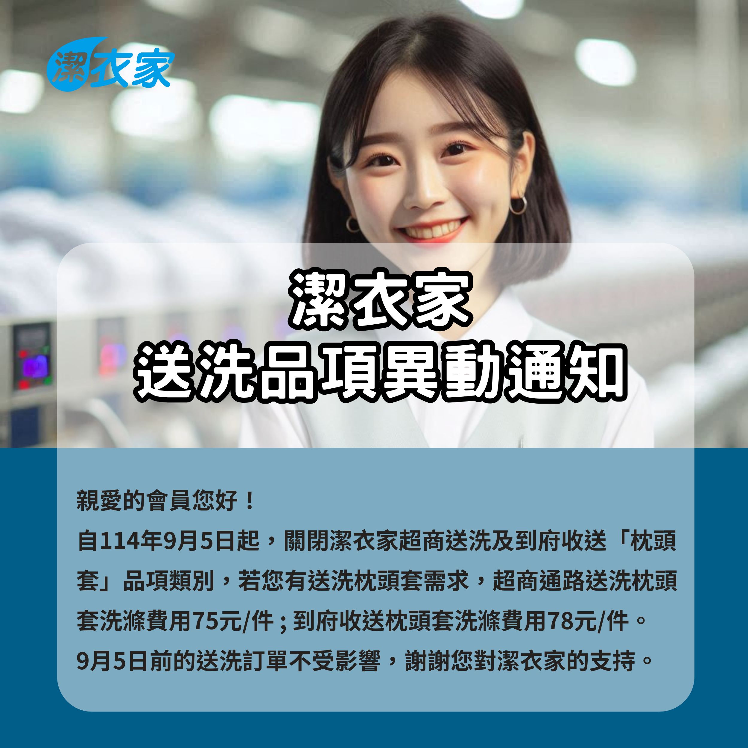 自114年9月5日起,關閉潔衣家超商送洗及到府收送「枕頭套」品項類別,若您有送洗枕頭套需求,超商通路送洗枕頭套洗滌費用75元/件 ; 到府收送枕頭套洗滌費用78元/件。