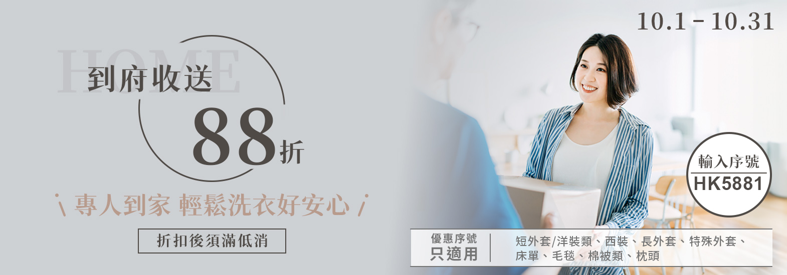 [優惠活動] 【10/1~10/31】到府收送 88 折(適用短外套/洋裝、西裝、長外套、特殊外套、床單、毛毯、棉被類、枕頭類)