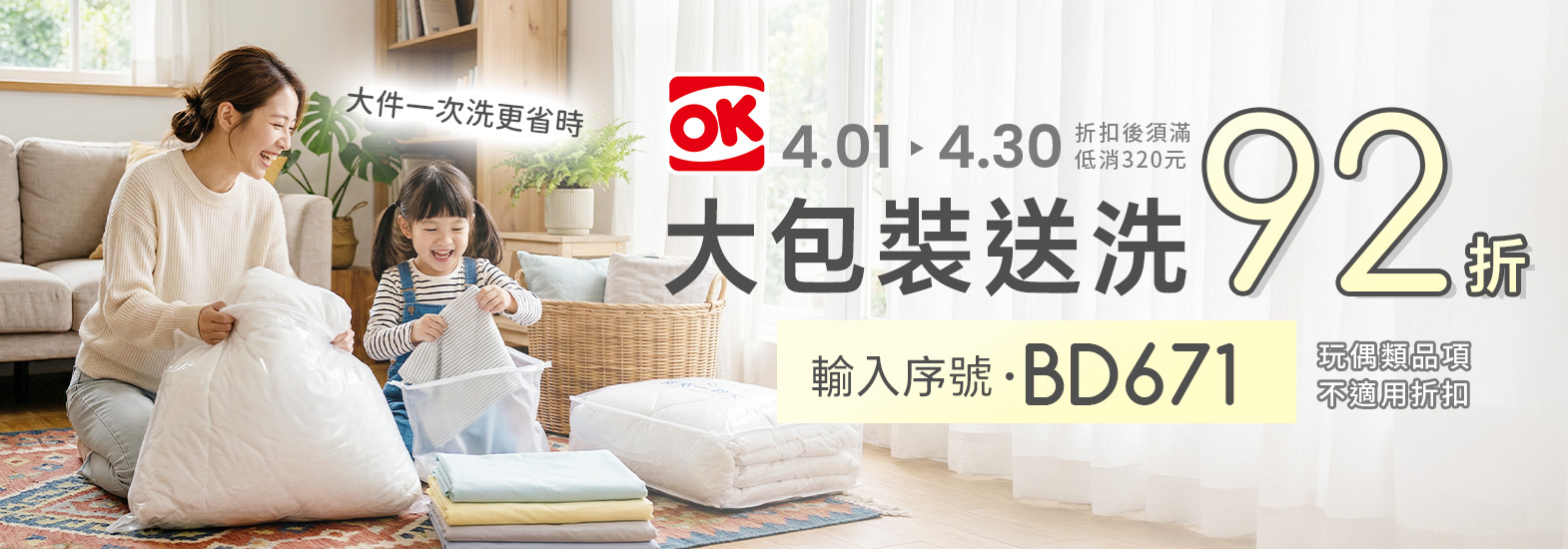 [優惠活動] 【4/1~4/30】OK超商大包裝送洗92折!(玩偶類品項不適用)